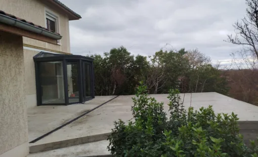 Avec beaucoup d'attention, de concentration et de professionnalisme, KS Maçonnerie à réalisé un terrassement dans un jardin très étroit surtout son accès pour pouvoir créer un projet de terrasse…