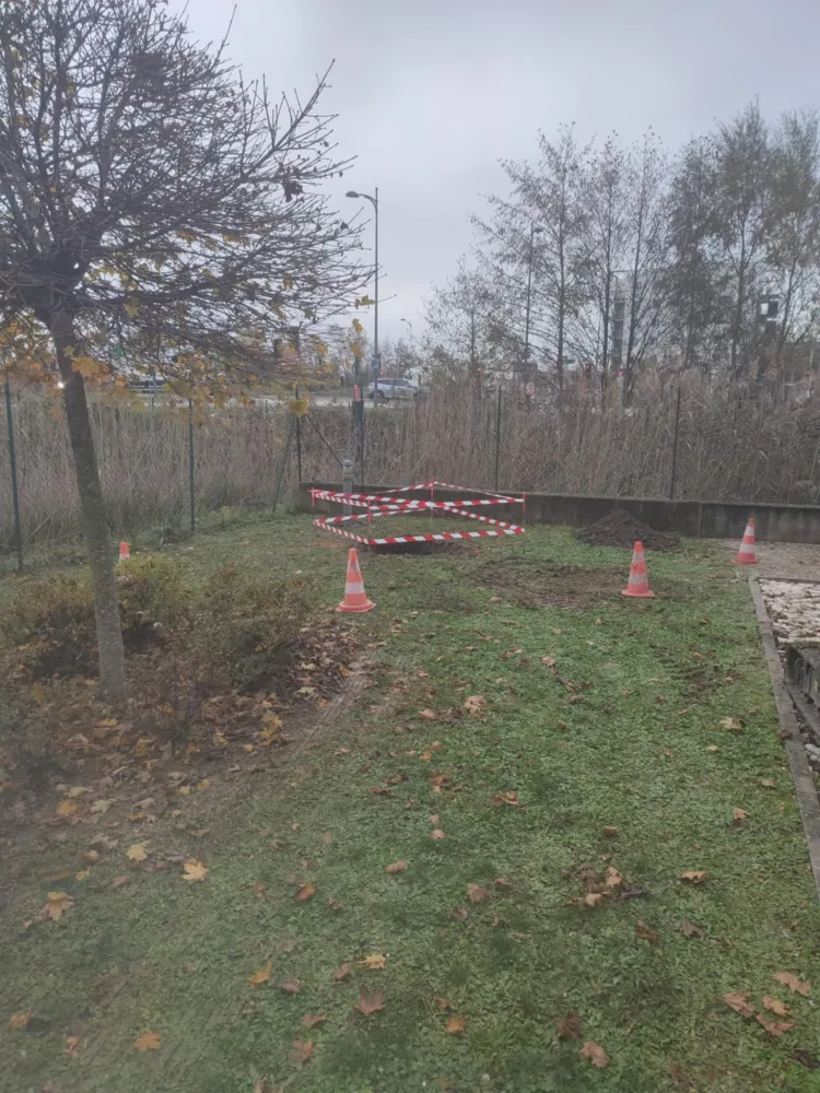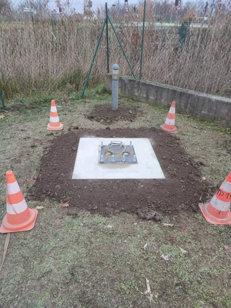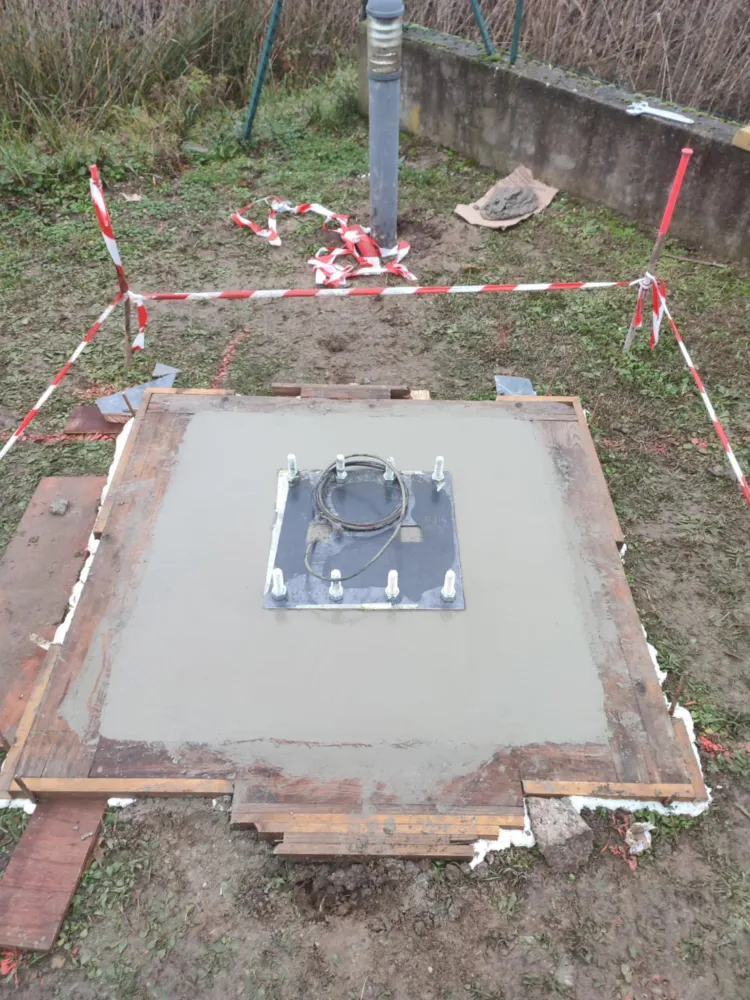 Zoomer 10-01-2026 Pour la pose d'un panneau led publicitaire, notre client nous a confié la réalisation d'un massif béton ainsi que la pose de la platine ancrée au massif pour fixer le mat métallique.